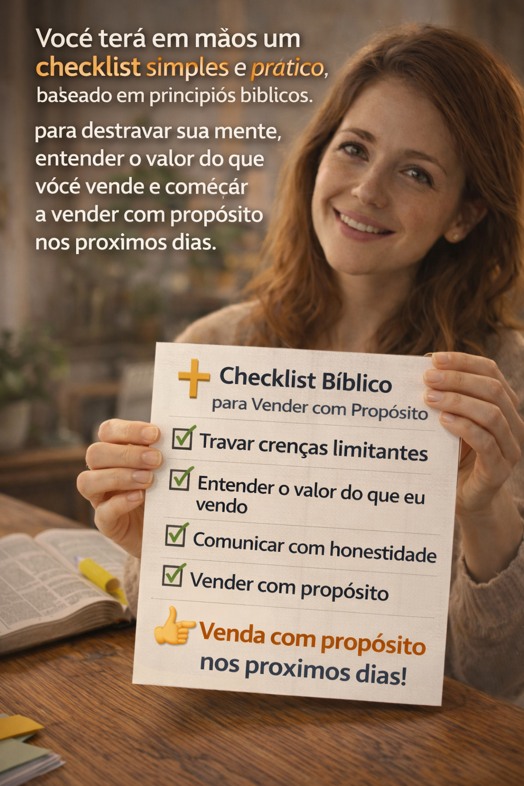 Você terá em mãos um checklist simples e prático, baseado em princípios bíblicos, para destravar sua mente, entender o valor do que você vende e começar a vender com propósito nos próximos dias.